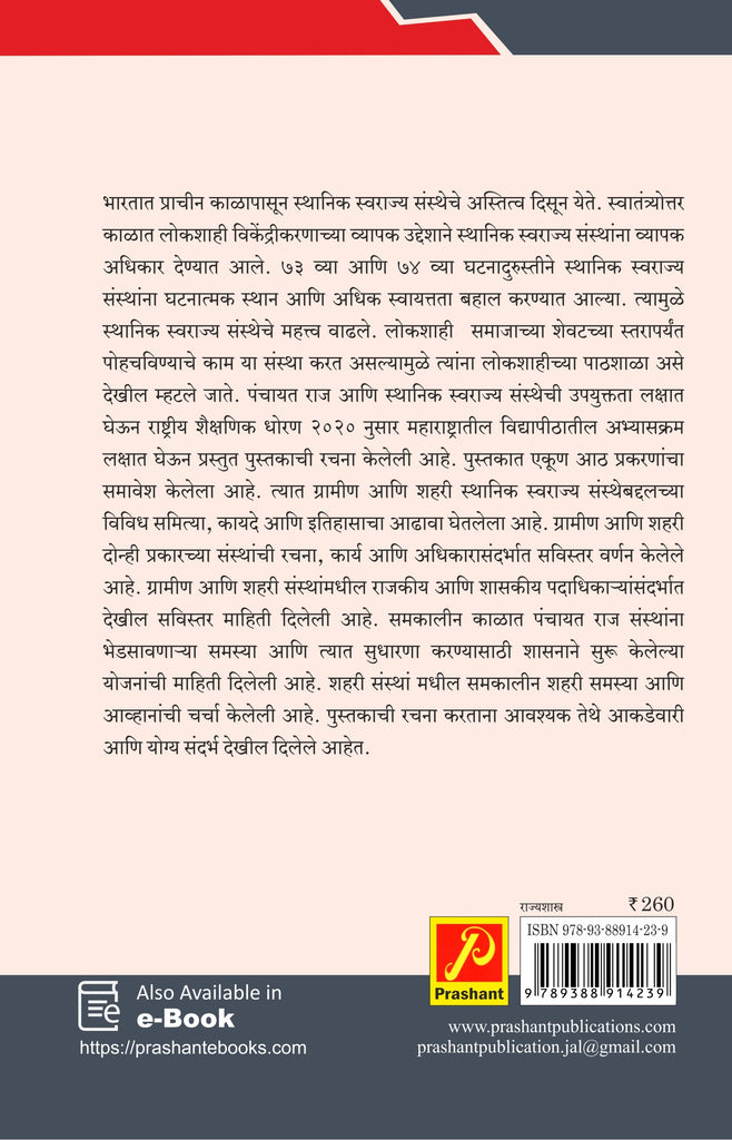 प्रस्तुत पुस्तक लेखनातून विद्यार्थी वर्गास पंचायतराज आणि नागरी स्थानिक स्वराज्य संस्था हा विषय समजण्यास हातभार लागेल, तसेच अभ्यासू प्राध्यापक वर्गाला अध्यापन करताना संदर्भ ग्रंथ म्हणून पुस्तक उपयुक्त ठरेल. सदर पुस्तक लिहिताना ग्रामीण व शहरी स्थानिक संस्था या विषयावर तज्ज्ञांनी लिहिलेल्या संदर्भ ग्रंथाचा आधार घेतलेला आहे.