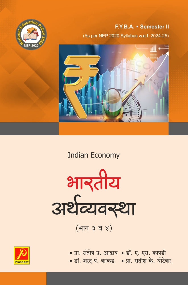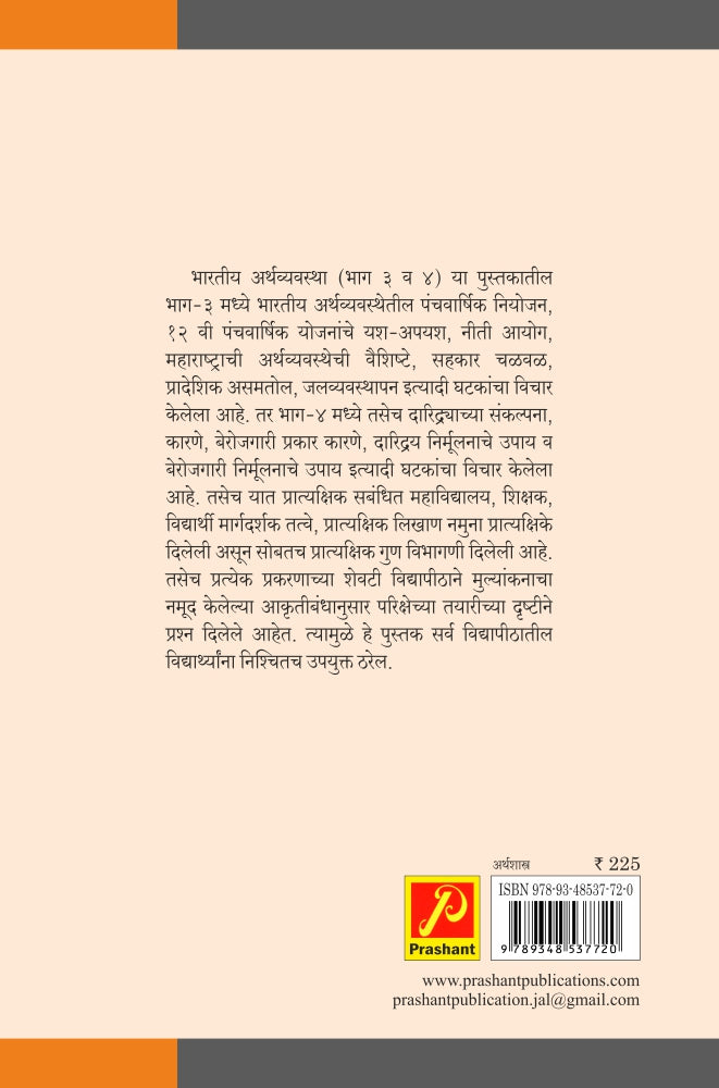 भारतीय अर्थव्यवस्था (भाग 3 व 4) या पुस्तकातील भाग-3 मध्ये भारतीय अर्थव्यवस्थेतील पंचवार्षिक नियोजन, 12 वी पंचवार्षिक योजनांचे यश-अपयश, नीती आयोग, महाराष्ट्राची अर्थव्यवस्थेची वैशिष्टे, सहकार चळवळ, प्रादेशिक असमतोल, जलव्यवस्थापन इत्यादी घटकांचा विचार केलेला आहे. तर भाग-4 मध्ये तसेच दारिद्य्राच्या संकल्पना, कारणे, बेरोजगारी प्रकार कारणे, दारिद्रय निर्मूलनाचे उपाय व बेरोजगारी निर्मूलनाचे उपाय इत्यादी घटकांचा विचार केलेला आहे. तसेच यात प्रात्यक्षिक सबंधित महाविद्यालय, शिक्षक, विद्यार्थी मार्गदर्शक तत्वे, प्रात्यक्षिक लिखाण नमुना प्रात्यक्षिके दिलेली असून सोबतच प्रात्यक्षिक गुण विभागणी दिलेली आहे. तसेच प्रत्येक प्रकरणाच्या शेवटी विद्यापीठाने मुल्यांकनाचा नमूद केलेल्या आकृतीबंधानुसार परिक्षेच्या तयारीच्या दृष्टीने प्रश्न दिलेले आहेत. त्यामुळे हे पुस्तक सर्व विद्यापीठातील विद्यार्थ्यांना निश्चितच उपयुक्त ठरेल.