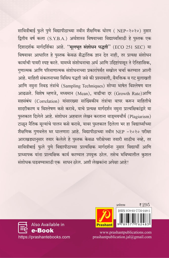 तसेच भाग-2 ‘मूलभूत संशोधन पद्धती’ मध्ये प्रात्यक्षिक मार्गदर्शक तत्वे, प्रात्यक्षिक मूल्यमापन, विद्यार्थ्यांना प्रात्यक्षिक परीक्षेच्या तयारीसाठी क्रमवार नमुना प्रात्यक्षिके याविषयी संपूर्ण माहिती दिलेली आहे, तसेच प्रत्येक प्रकरणाच्या शेवटी विद्यापीठाने मुल्यांकन नमूद केलेल्या आकृतीबंधानुसार परिक्षेच्या तयारीच्या दृष्टीने प्रश्न दिलेले आहेत. त्यामुळे हे पुस्तक विद्यापीठातील कार्य क्षेत्रातील सर्व विद्यार्थ्यांना उपयुक्त ठरेल हा प्रामाणिक हेतू समोर ठेवून पुस्तकाचे आम्ही लिखाण केले आहे.