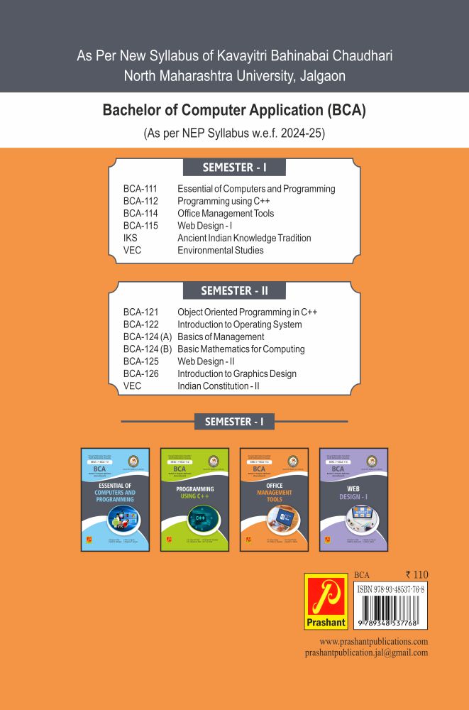 This text is in accordance with the new syllabus NEP-2024 recommended by the Kavayitri Bahainabai Chaudhari North Maharashtra University, Jalgaon, which has been serving the need of F.Y.B.C.A. Computer Science students from various colleges. This text is also useful for the student of Engineering, B.Sc. (Information Technology and Computer Science), M.Sc, M.C.A. B.B.M., M.B.M. other different Computer courses.